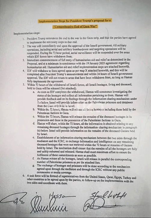 The 6-step plan agreed yesterday covers only points 2, 3, 4, 5, 7, and 8 of Trump’s earlier 20-point plan. It notably makes no mention of any effort to “de-radicalize” the population of Gaza, or of the other portions of Trump’s plan that envisaged a colonial-style administration being installed in Gaza under the viceroy-ship of widely discredited former UK prime minister Tony Blair.