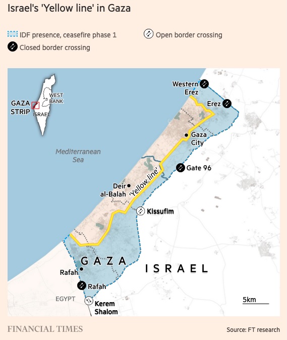 Kushner’s plan, as described here in The Atlantic (house organ of former Israeli prison-guard Jeffrey Goldberg) is that the Israeli military should stay in that 53% of Gaza’s land where they have remained since the October 13 (quasi-)ceasefire. Then, in that space east of the “Yellow Line” the U.S.-Israeli partners should build a network of what Kushner and his cronies reportedly call “Alternate Safe Communities.” (But why don’t we just call them Strategic Hamlets, instead?)