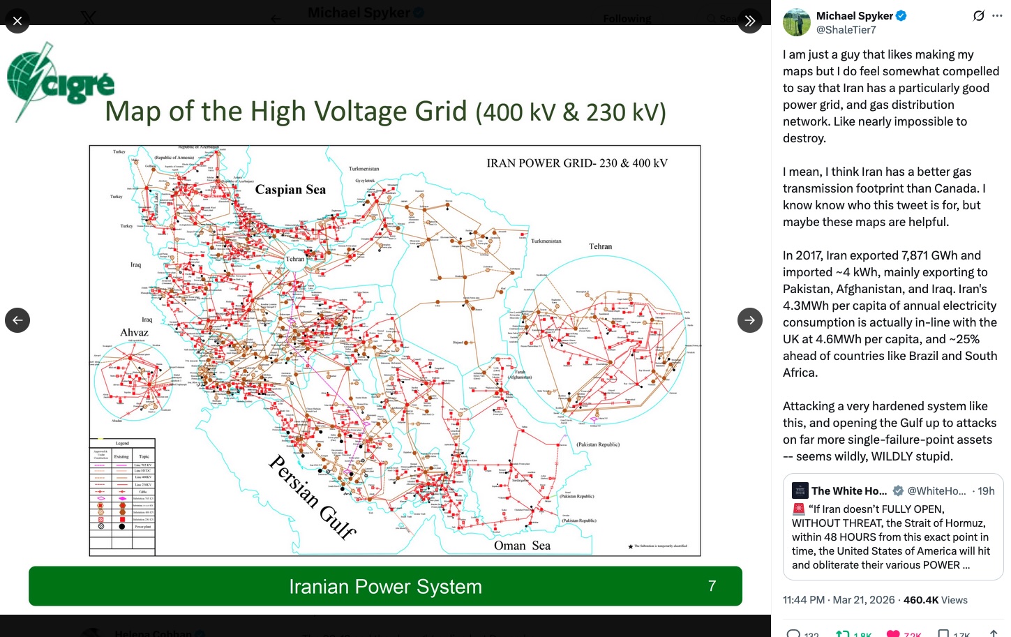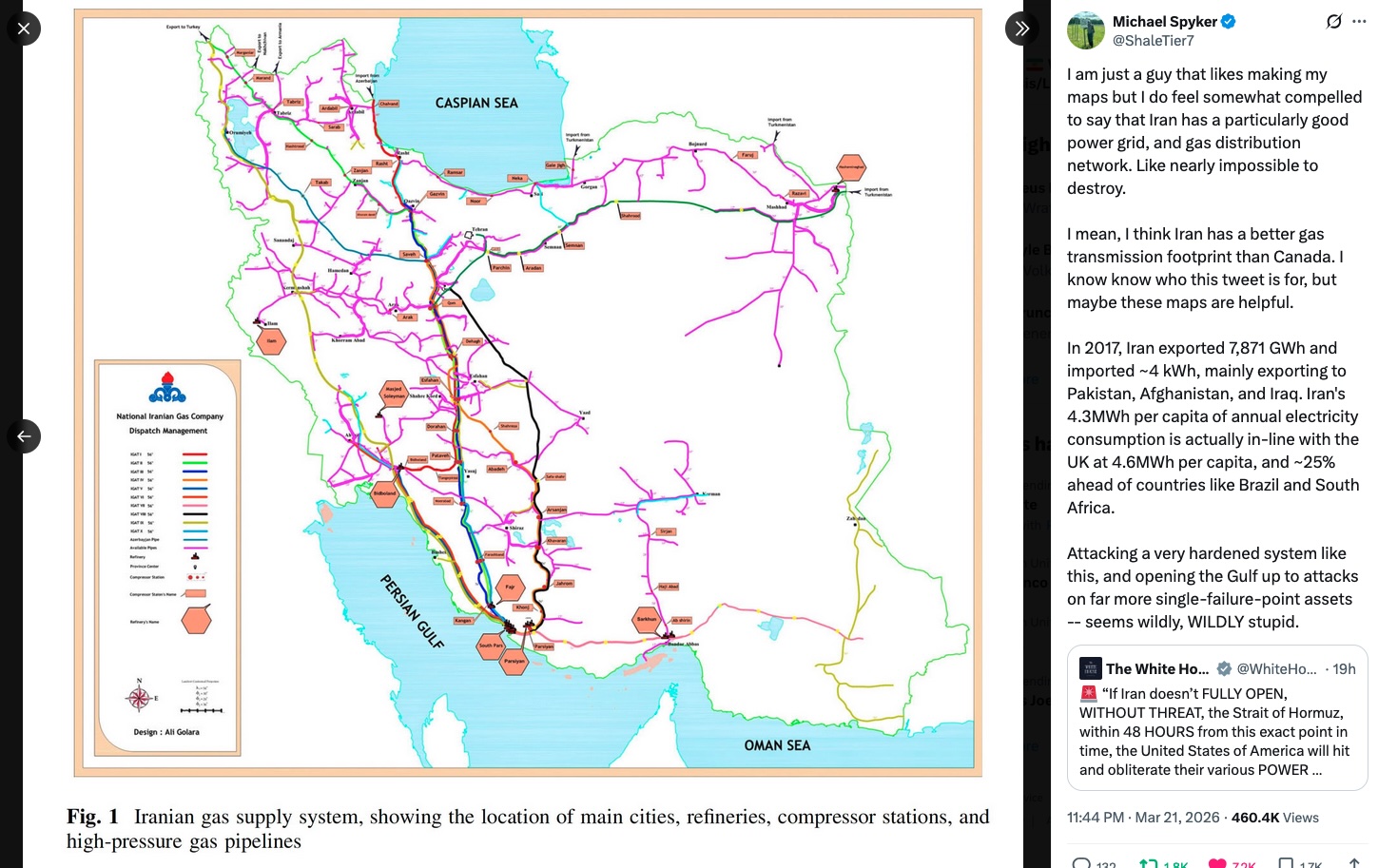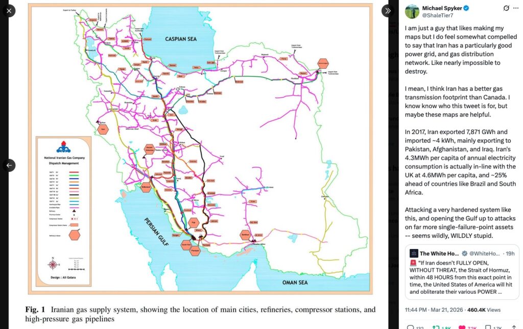 We’ve already seen in action the resilience of Iran’s political and military infrastructure. Regarding its physical infrastructure, on March 21, after Trump’s latest round of threats, the Canadian infrastructure specialist Michael Spyker released on X a number of maps (and associated commentary) that demonstrate the hardiness of this infrastructure: