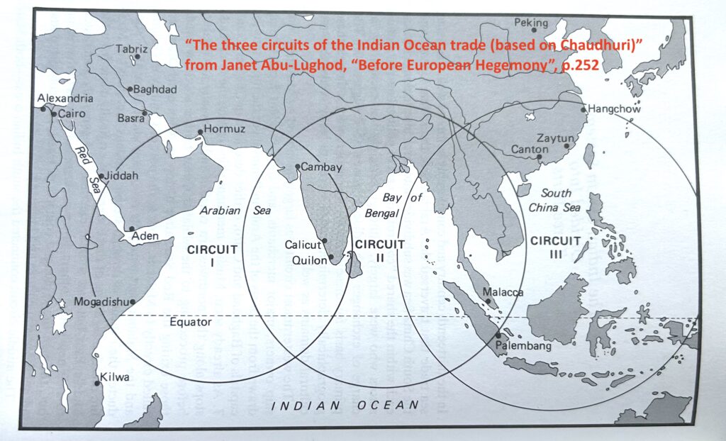 For centuries prior to that event, as Janet Abu-Lughod described expertly in her 1989 book Before European Hegemony: The World System A.D. 1250 – 1350, nearly the whole of the Indian Ocean had been a zone in which merchants from all the different shores could generally trade their wares freely with each other, subject only to the fees that the various different coastal polities imposed for port services, brokerage, and warehousing services. In most of the area of the three overlapping maritime “circuits” that Abu-Lughod identified, no single naval power “controlled” the seas distant from their own home shores. Merchants, travelers, and (mainly Muslim) pilgrims could travel long distances across these waters, generally pretty safely.